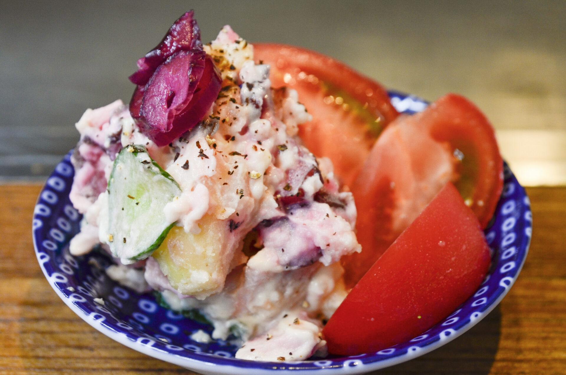 柴漬けでさっぱりと仕上げた自家製ポテトサラダです。箸休めにもアテにもおすすめです♪
